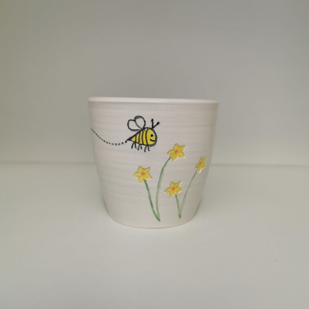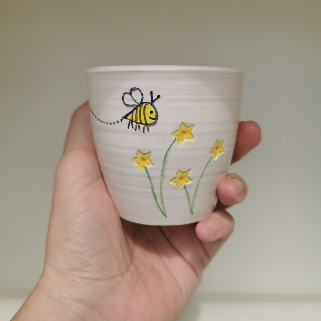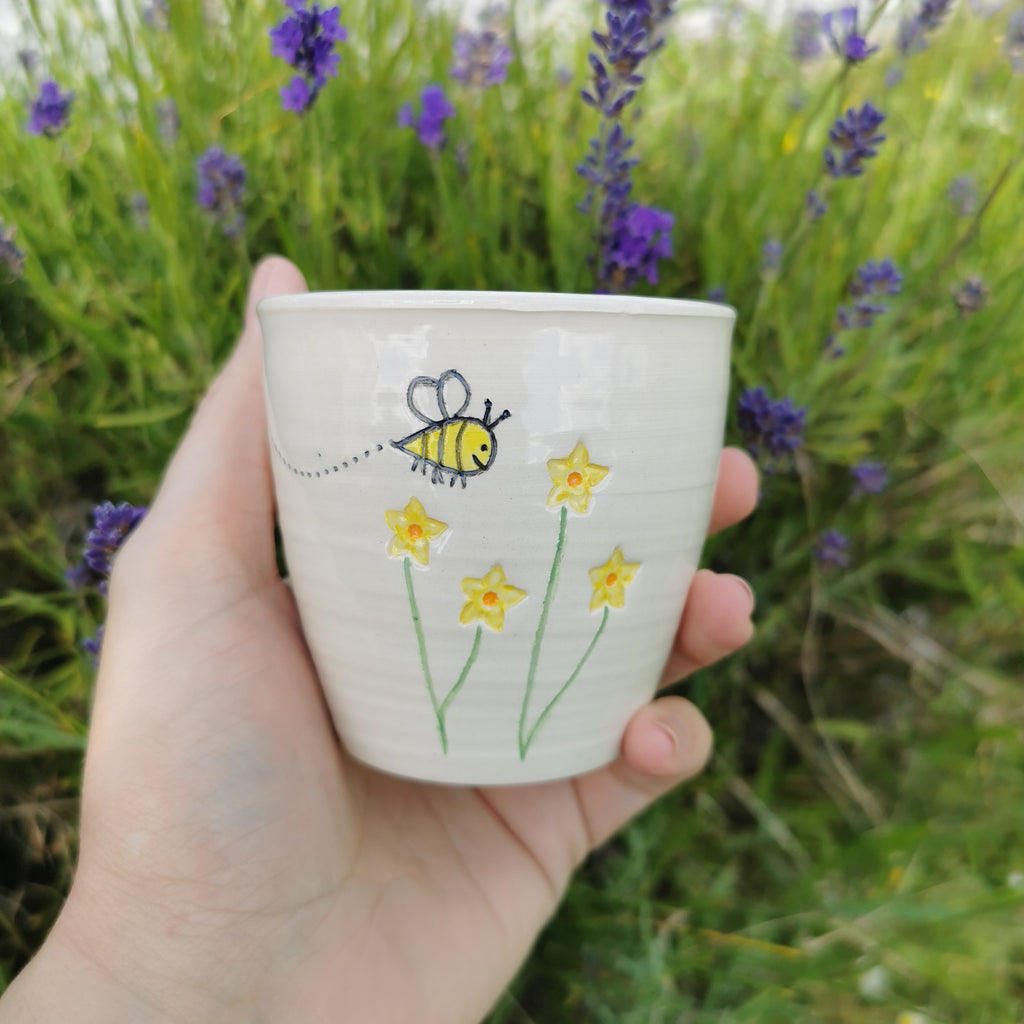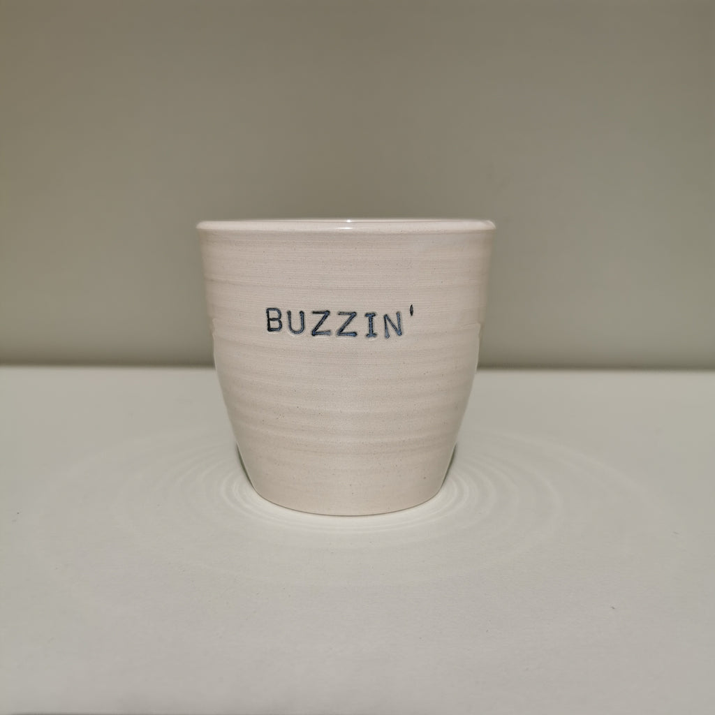 Our 6oz / 15ml coffee cups have been made to match some of our Travel Mug designs. Due to popular demand, we've now made mini Bee cups! This design has a bee pollinating a bunch of flowers on one side, and opposite is the imprinted word 'Buzzin'.