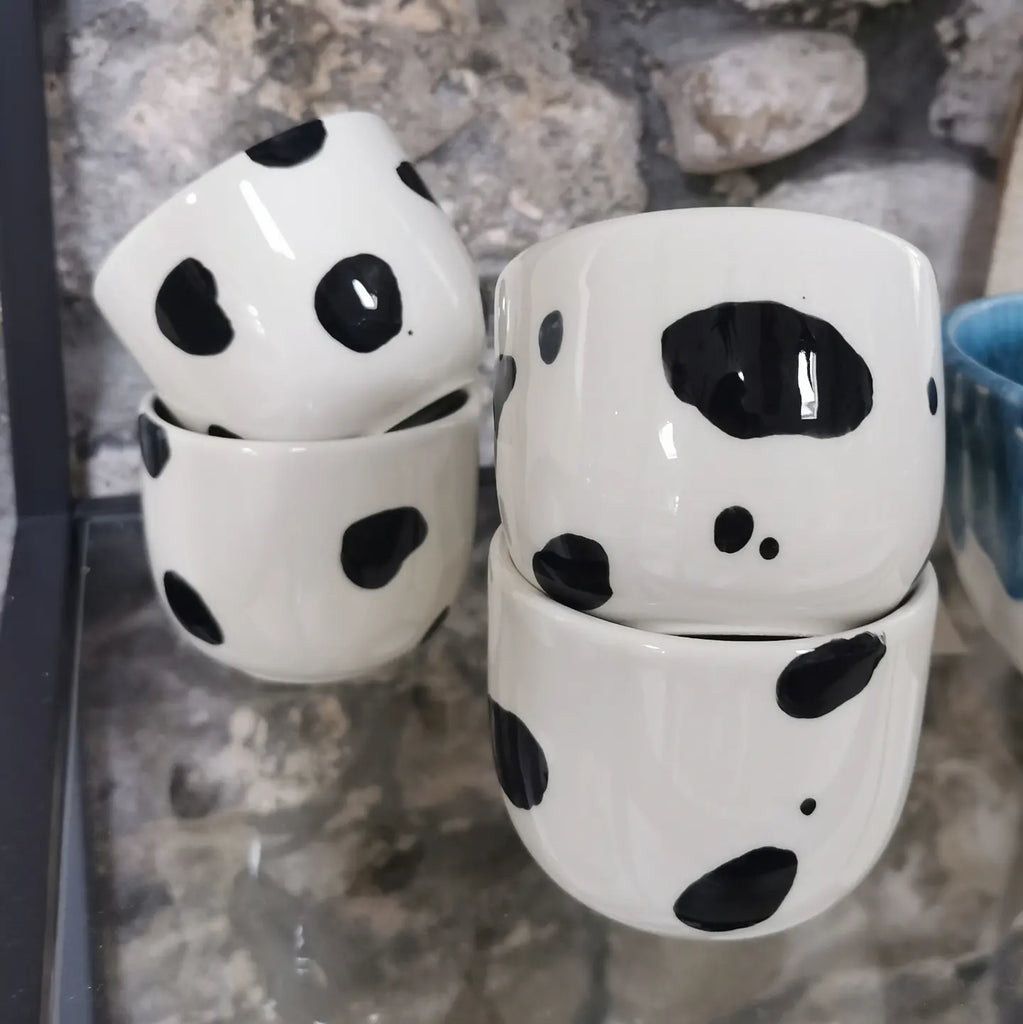 These bovine inspired ceramic cups are decorated with black batches of glaze against a white coloured base.