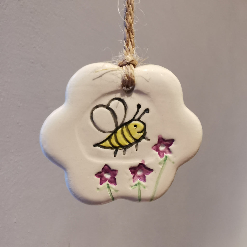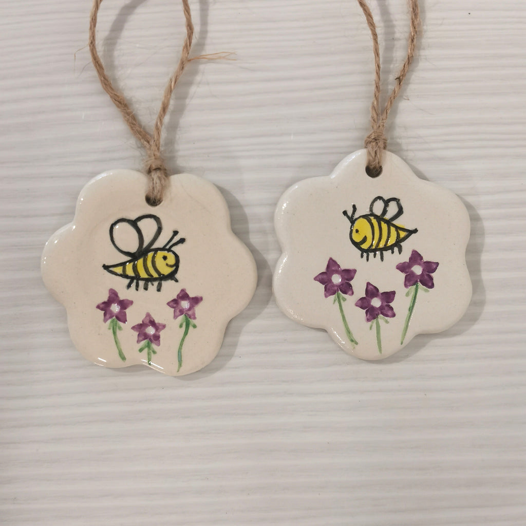 We hand roll a clay slab and cut a flower shape to form the piece. Imprinted with flowers and hand a hand drawn bee. All handpainted and glazed.